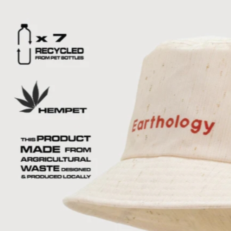 หมวกดีไซน์สุดชิค ผลิตจากเส้นใยผ้าที่มาจากการรีไซเคิลขวดพลาสติกและนำมาผสมกับเส้นใยกัญชง ซึ่งได้มาจากแกนกัญชงที่เหลือทิ้งจากการเก็บเกี่ยวผลผลิตของเกษตรกร ซี่งมีคุณสมบัติต่อต้านแบคทีเรีย ความทนทาน และความแข็งแรงในตัว